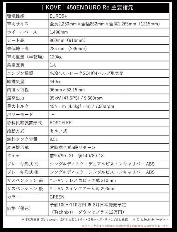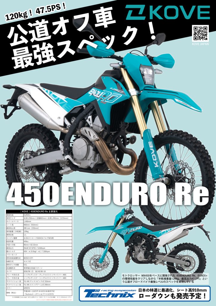 KOVEのモトクロッサー MX450をベースに開発された 450ENDURO Re。EURO5+の環境性能をクリアしながら「半乾燥重量120kg、最高出力47.5PS」という公道オフロードバイク最強レベルのスペックを実現している