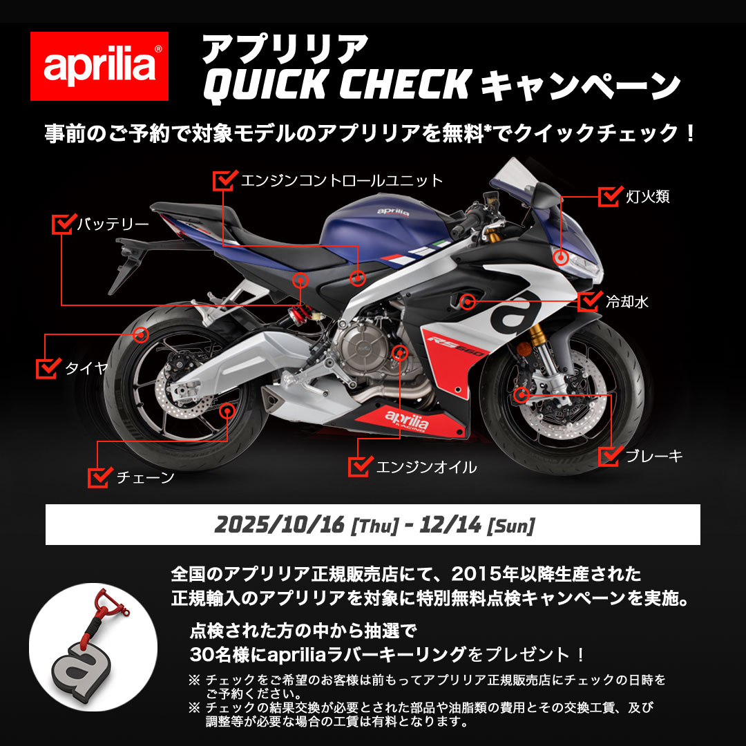 2025年10月16日~12月14日までアプリリアクイックチェックキャンペーンを開催致します。