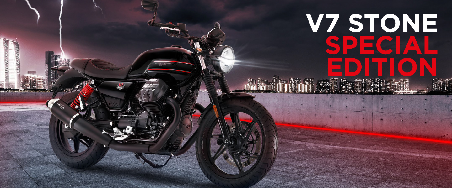 V7 ファミリーの中で最も現代的なストーンバージョンの特徴であるマットな色合いを取り払い、専用カラーであるシャイニングブラックのカラーをフューエルタンクに採用し、そのスタイルを強く印象付けるグラフィックと赤いディテールを加えています。