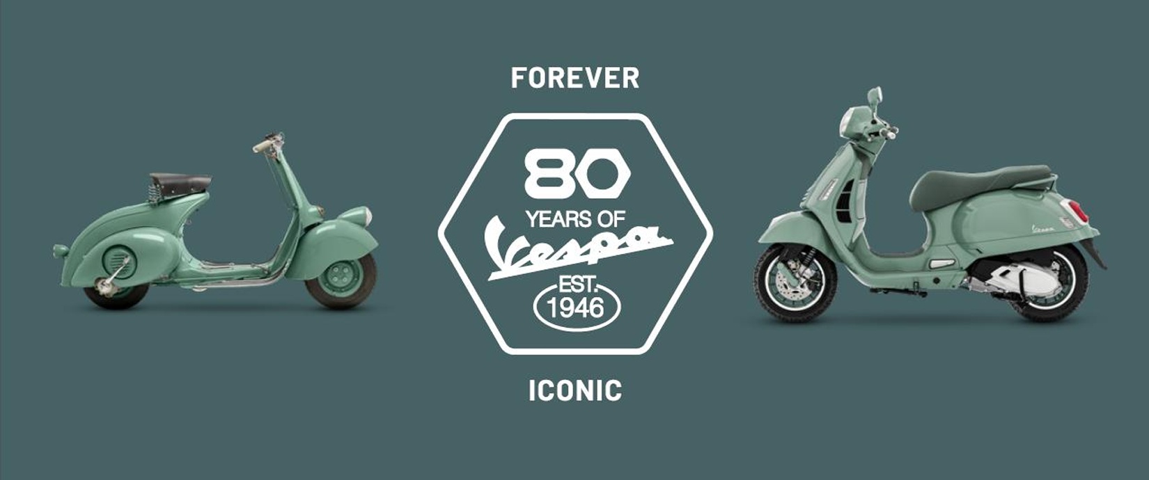 フロントシールドには、伝統のVespaロゴに「80th」ロゴがあしらわれ、レッグシールド内側のグローブボックスリッドには、この大切な節目を祝うベスパ誕生80周年記念バッジが装着されています。